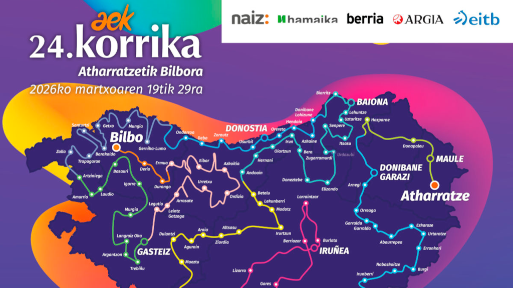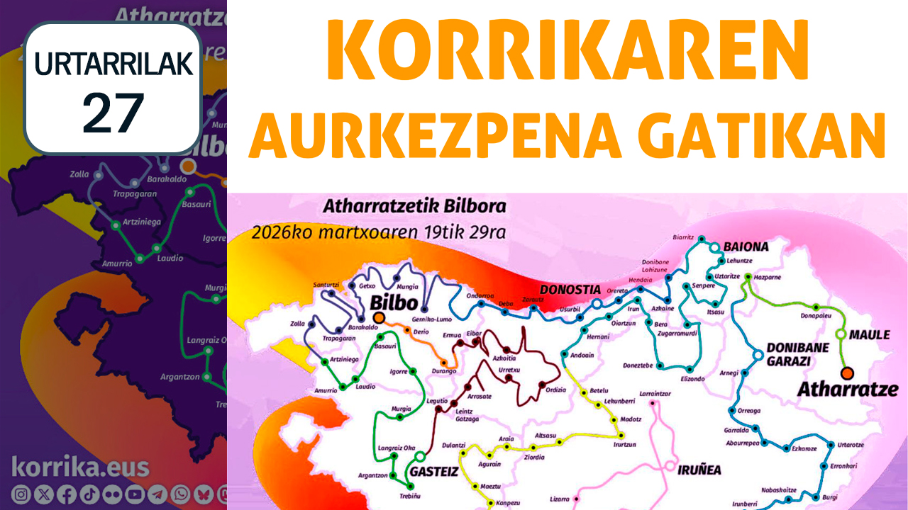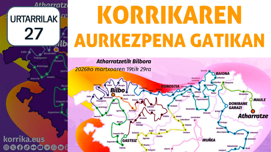 egilea BatzordeaEdizino honetan, lasterketa Atharratzetik aterako da 2026ko martiaren 19an, eta, hamaka egunez Euskal Herri osoa igaro ostean, Bilbon amaituko da, hil bereko 29an; gitxi gorabehera 2175 kilometro izango dira eta 460 herri igaroko dauz. Korrika euskeraren aldeko lasterketa erraldoia da. Hamaka egunez, lotu barik, Korrikak Euskal Herria zeharkatzen dau. Ekimena AEK-k ipini eban abian 1980an…Irakurri gehiago “AEK-k 24. KORRIKAren ibilbidea ezagutzera emon dau” »